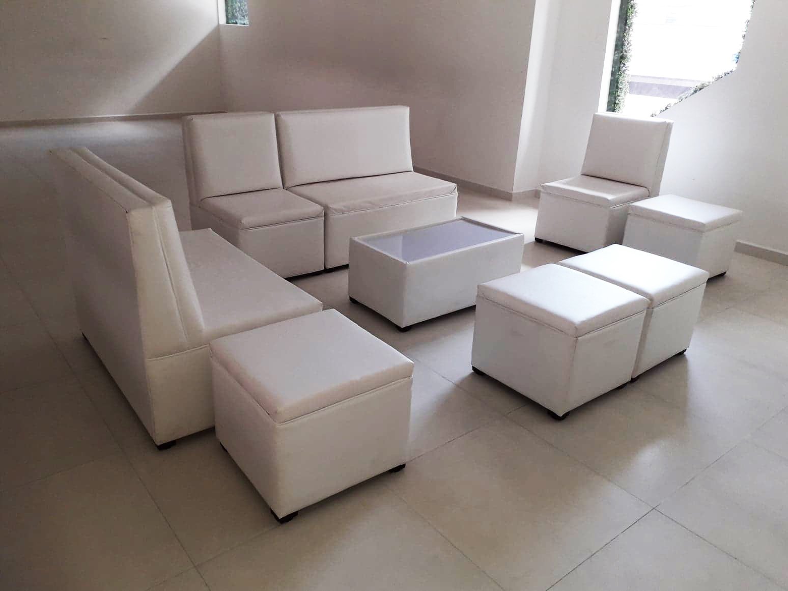 2 sillones para 2 pesonas, 2 sillones individuales, 4 puffs, mesa de centro